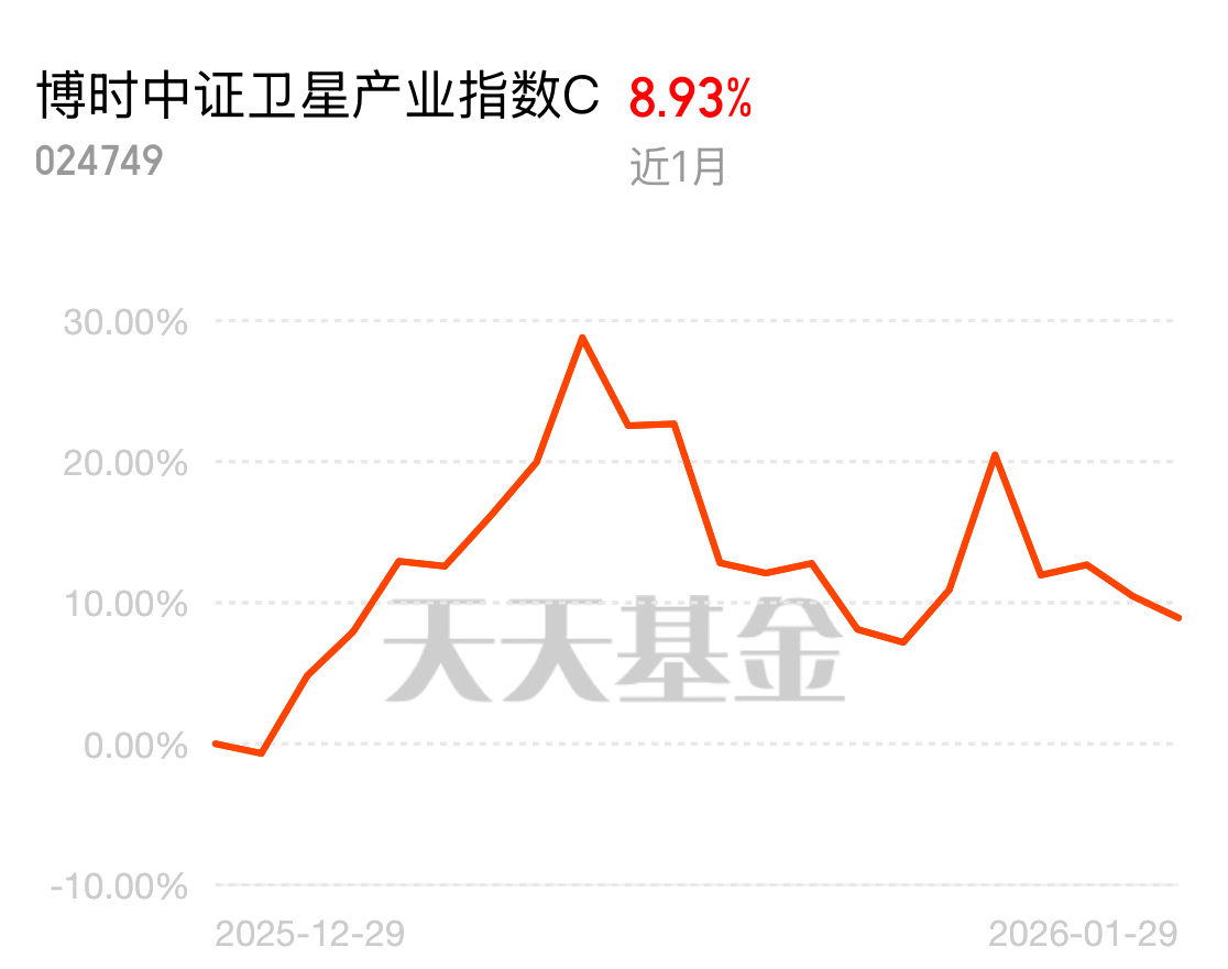 跟踪的中证卫星产业指数,覆盖了卫星制造、发射、运营等全产业链50家核心企业。这基表现相当亮眼,从去年11月到今年1月涨幅超过40%,整体趋势向上。看好中国商业航天的产业升级和国产替代,现在政策支持力度大,商业航天司设立、行动计划发布,感觉这个赛道才刚刚开始。
