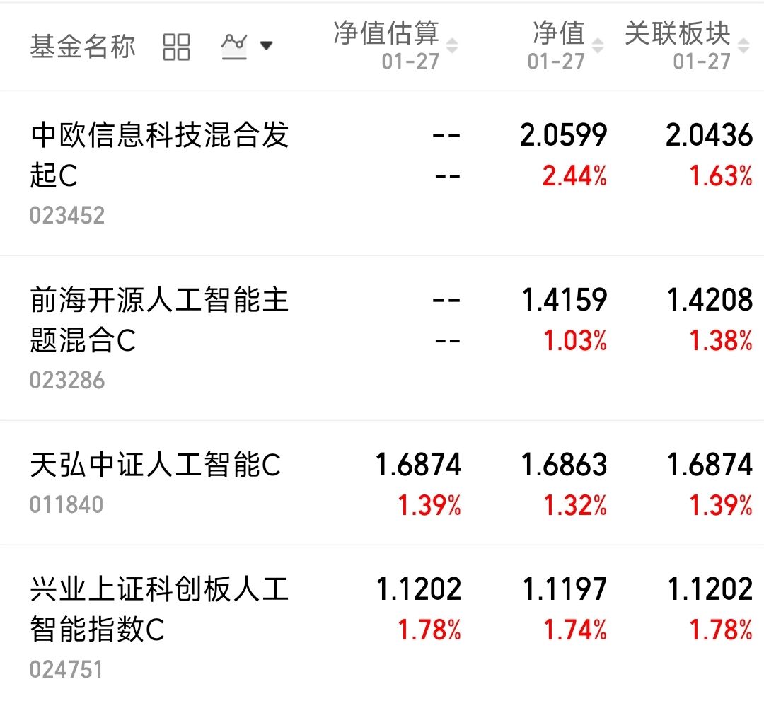 市场里科技板块先企稳反弹,不光带动了市场人气,赚钱效应也明显变好了。盘面上看,上午半导体跟着大盘探底回升,领涨整个市场,午后软件服务、军工航天接棒上涨,市场里翻红的个股也跟着多了起来。$中欧信息科技混合发起C(OTCFUND|023452)$上涨2.44%,$前海开源人工智能主题混合C(OTCFUND|023286)$上涨1.03%,$天弘中证人工智能C(OTCFUND|011840)$上涨1.32%。