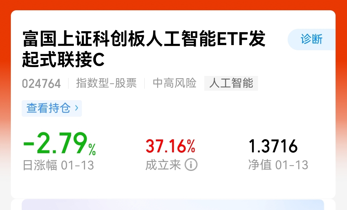 人工智能时代,趋势一直都在,这时候调整正是给我们机会,$富国上证科创板人工智能ETF发起式联接C$ 今日跌幅2.79%,近一周涨幅8.05%,近一个月涨幅17.41%,涨了这么多了有调整很正常,不可能一直上涨的,倒车接人的机会,在科技强国战略持续推进、数字经济加速渗透的背景下,AI应用越来越广泛,这个利好不断,上涨空间是有的。