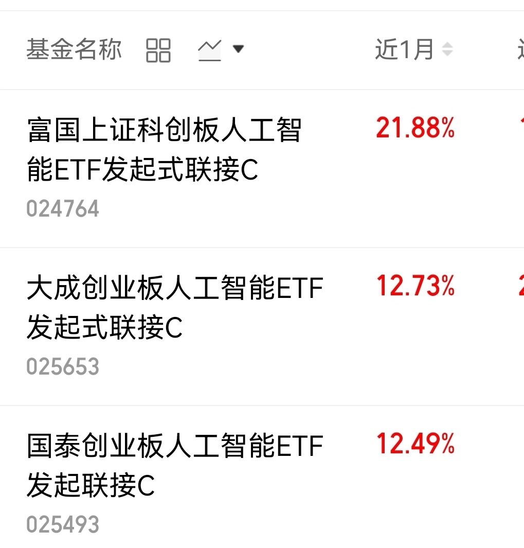 今天大盘是真不错啊,低开高走 尾盘三大指数都拉红了,特别是科创人工智能,今天涨幅居前,$富国上证科创板人工智能ETF发起式联接C$ 今天涨1.79%,不错啊,看了下近一月的走势,达21.88%,涨幅居前,果然每一次回调都是加仓信号。我对AI人工智能的长期逻辑有信心。