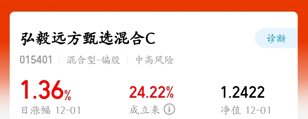 机器人板块今天虽有点调整,但好在昨天涨过一波打底弘毅远方甄选混合C 昨日拿下1.36%的涨幅,表现已经很给力了!今天估值虽小幅回调,但近一年24.22%的收益摆在这里, 毕竟机器人应用场景越来越广,长期逻辑在线,希望后续能稳住行情
