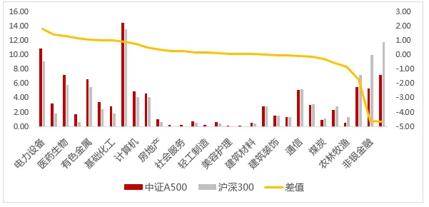 中证A500与沪深300的申万一级行业分布对比