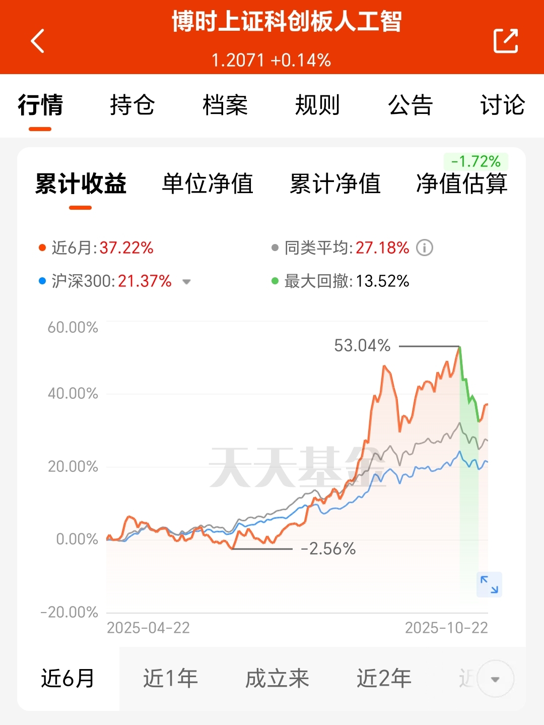 这个基金紧密跟踪上证科创板人工智能指数,聚焦人工智能产业链各环节的核心企业,近6个月收涨37.22%,领先同类平均的涨25.62%和沪深300的涨21.37%,还是非常优秀的。它的管理费仅0.5%/年,托管费0.1%/年,这个低费率也是我比较看好的。