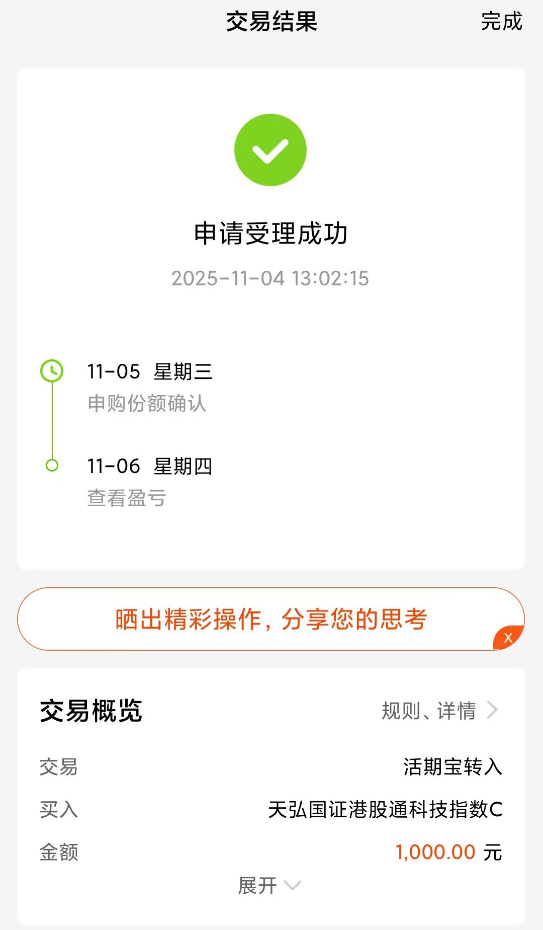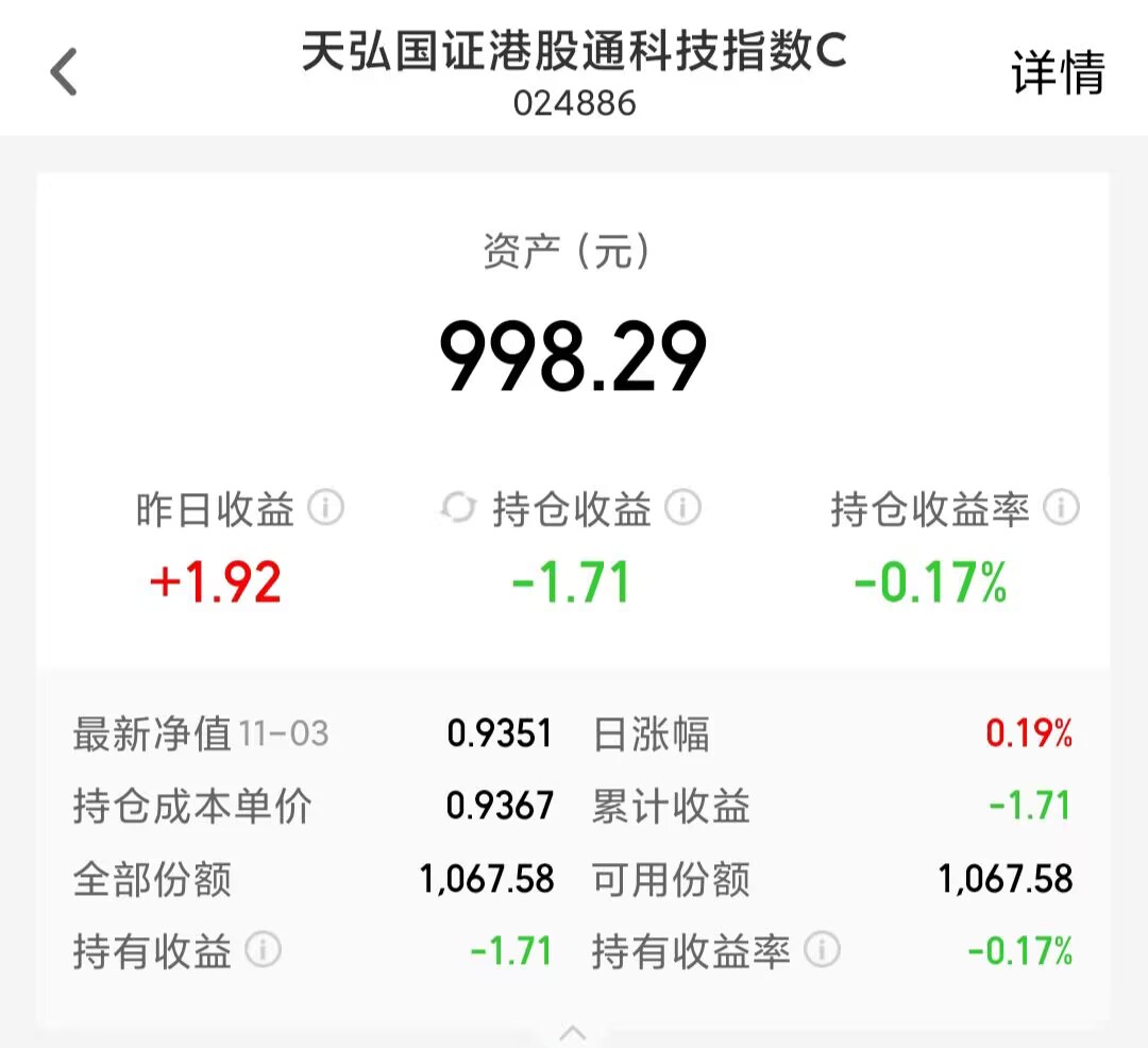 1.加仓1000元$天弘国证港股通科技指数C(OTCFUND|024886)$A股今天冲高回落,其中部分科技股跌幅明显,受此影响,港股科技股也是回调,不过港股中的科技股跌幅相对于A股还是偏小的,显现出一定的抗性。港股通科技已经回调了一段时间,我感觉修复的差不多了,并且美联储在上周再次降息25个基点,南向港股通资金持续流入,抄底港股迹象明显,我感觉港股通科技回调接近尾声,随时都有可能企稳拉升。