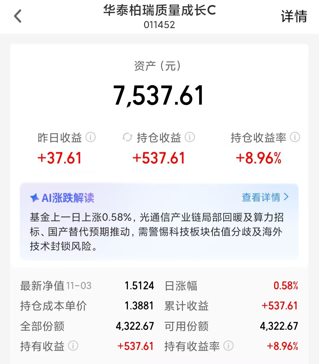 2.加仓1000元$华泰柏瑞质量成长C(OTCFUND|011452)$,CPO是今年最强主线,该基金重仓股囊括三大龙头“易中天”,今年正好抓住了这波大行情,其今年收益高达100%,是少数翻倍基金之一。