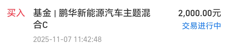今天我买入$鹏华新能源汽车混合C(OTCFUND|016068)$2000块钱。