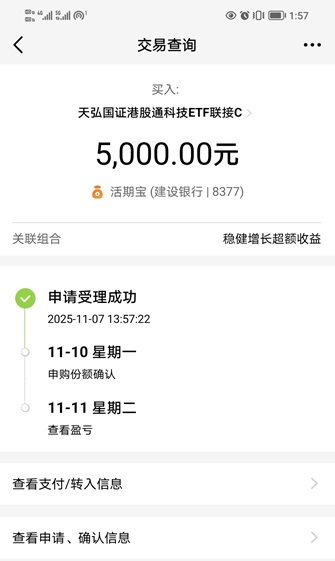 近期特朗普政策关门持续时间创了历史记录,导致短暂的流动性枯竭,引发美股市场回调。昨晚美股回调明显,进而又影响了今天的港股科技。但我认为这种影响持续性很差,相信特朗普政府也不会持续关门,而美处于降息中期,12月要停止缩表,中长期流动性非常充裕。短期的回调是非常难得的进场做多机会。从基本面来看,在AI的加持下,美股科技表现强势,中长期震荡上行概率很大。这也会进一步影响到港股科技。我看好港股通科技接下来表现,今天趁着指数小回调继续加仓本基金,后面也会继续寻找机会加仓它。下面我晒一下买入操作记录: