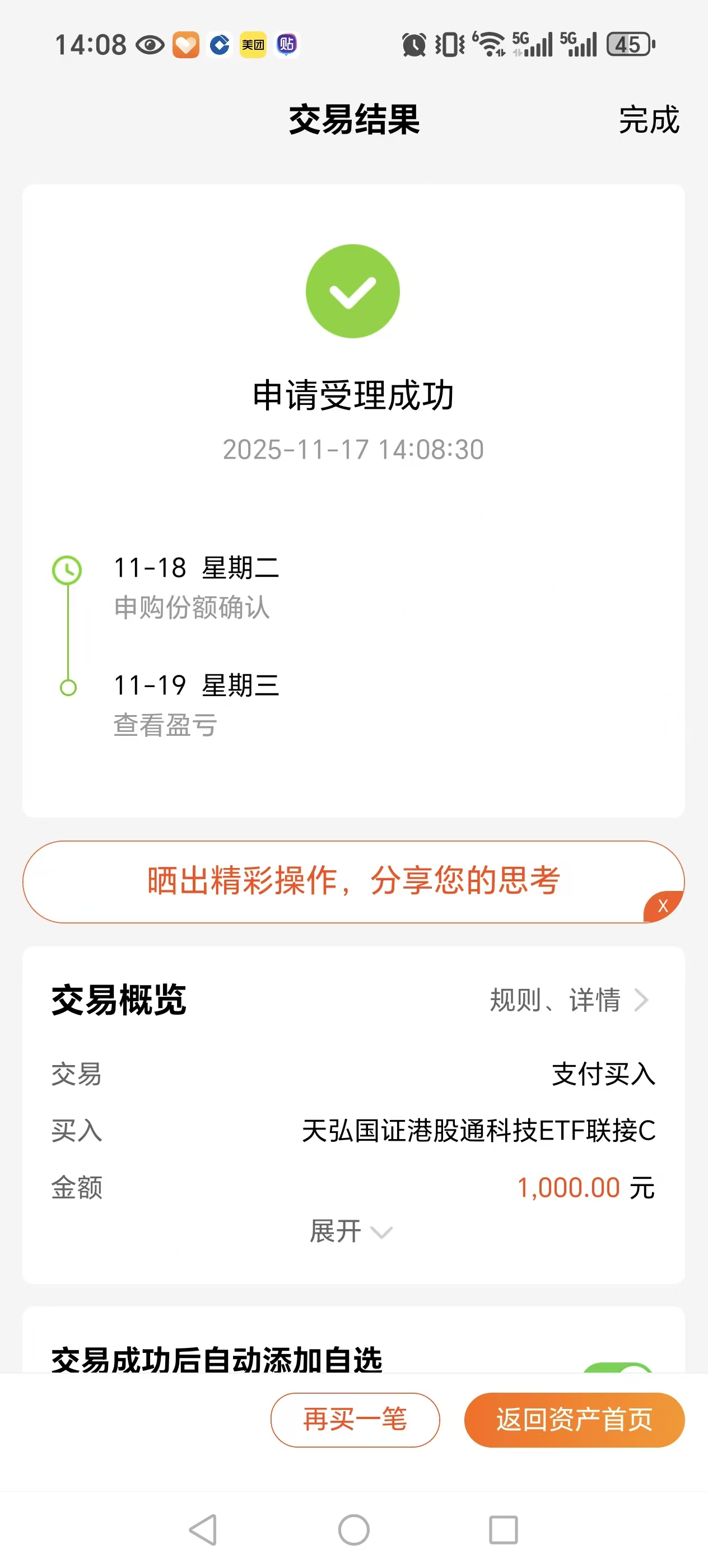 买入$天弘国证港股通科技ETF联接C$ 1000元