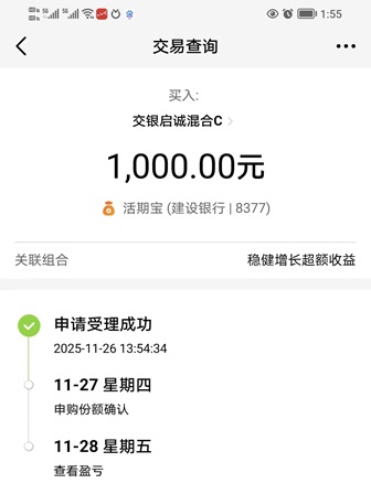 3.电力基建:我今天新建仓$交银启诚混合C(OTCFUND|014039)$1000元。这支基金是可以布局A股和港股市场的主动管理型基金,持续稳定布局基建地产等周期股,目前有港股公用事业方向的大唐发电、华能国际、华电国际等,也有建筑材料方向的兔宝宝、江河集团,还有轻工制造机械设备以及银行等,布局均衡分散,把握多元机会,严控回撤,近1年波动率为12.5%,夏普比率为2.05,回大回撤仅有8.53%,表现均优于95%的同类。成立以来业绩持续跑赢沪深300,超额收益超40%。基金经理杨金金是属于划线派,从业5年多,平均年化回报23.90%,成绩非常优秀,是金牛基金经理奖得主。目前本基金打开了限额,是难得的进场机会,我果断建仓它。下面我晒一下买入操作记录: