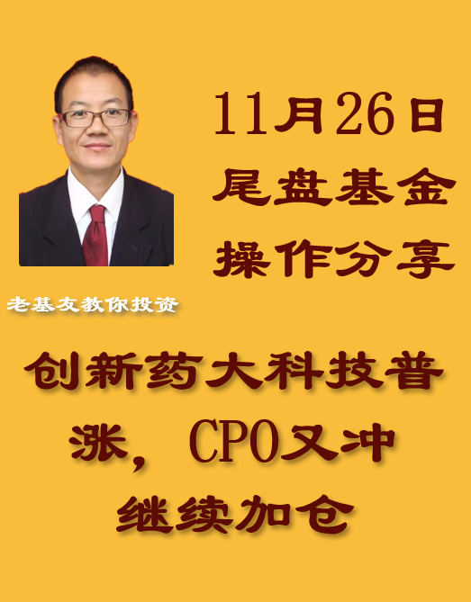 11月26日A股三大指数继续反弹,截止我发文时,上证指数涨0.14%,深证成指涨1.61%,创业板指涨2.76%。A股总成交量11439亿,相比上一个交易日同期缩量392亿,估计全天量能在1.9万亿左右。两市有2821只个股上涨,有2380家下跌。创新药、能源金属、CPO、通信设备、半导体、F5G概念等涨幅靠前,中船系、军工、游戏、保险、传媒、养殖等板块跌幅靠前。今天社保重仓涨0.29%,养老金重仓涨0.39%,基金重仓涨2.27%,证券微红0.02%,保险跌0.73%,银行跌0.9%。国家队没有明显动作,社保、养老金小幅进场,公募大力抢筹,进场意愿强烈,成交量仍然偏少,我看好A股十二月的表现,今天继续加仓港股科技、CPO、电力基建、固态电池、物联网、多元债基。