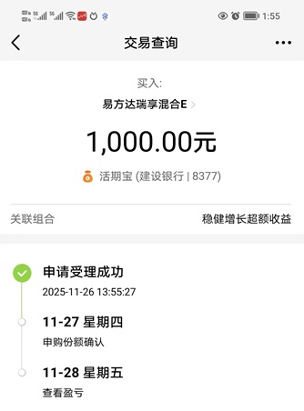 我小心查看它近6个季度的持仓,发现它大多数时候都聚焦大科技赛道,几乎吃到了CPO光模块近几年的高成长全过程,但其它配置方向有所轮动,比如24年二季度配置了较多的航空公司,24年三季度布局了一些汽车板块个股。整体来说本基金近1年涨99.14%,近6月涨99.20%,表现非常优秀,可见基金经理非常强的择股择时能力。目前A股大盘稳定在4000点左右,整体情绪很不错,有利于主动管理的灵活配置型基金产品追求超额收益。也就是说当前市场很适合优秀的基金经理抓住波段机会,把握当前热点,获得丰厚的超额收益。我对本基金接下来的表现非常有信心,今天果断建仓它。下面我晒一下买入操作记录: