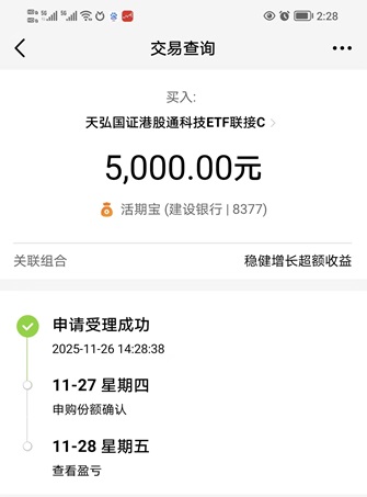 近期港股科技中有多家互联网科技企业发布三季报,阿里、腾旭、小米等表现都不错。美科技股如英伟达和谷歌等三季报也超预期,这些都预示着科技的增强仍然动力十足。只要美科技股能够打破AI泡沫的猜疑,港股科技也就能够止跌反弹。叠加美12月将要停止缩表,中长期流动性正在逐步释放。短期的回调是非常难得的进场做多机会。我看好港股通科技接下来表现,今天继续加仓本基金,后面也会继续寻找机会加仓它。下面我晒一下买入操作记录: