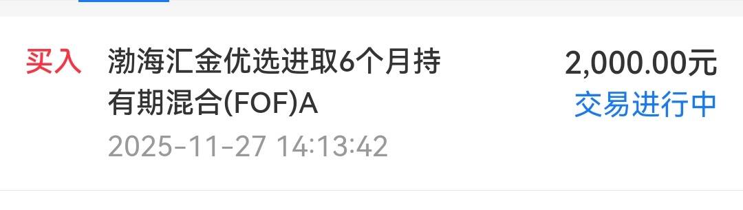 6、$渤海汇金优选进取6个月持有混合发起(FOF)A(OTCFUND|018674)$,买入2000元