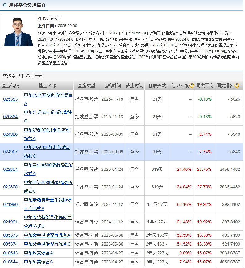 中加基金投研团队始终坚持长期价值投资理念,秉承“真诚所以信赖,专业所以卓越”的精神,对受托资产管理勤勉尽责,整体中长期业绩表现具有较强竞争力。本基金由中加基金量化新锐林沐尘担纲,他拥有8年证券从业经验,积累了深厚的投资实战经验,截至2025年6月30日,其管理的部分基金均大幅跑赢业绩比较基准。