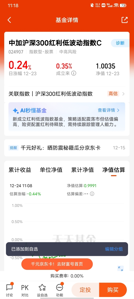 #年末如何防守反击# $中加沪深300红利低波动指数C$ 近12个月稳健运行,年末持有真的太安心了!年末市场最大的风险就是波动,高估值板块回调压力大,想布局跨年行情又怕被套,这时候红利低波这种防御性资产就该站C位,而这只基就是防御配置的优选。先看核心优势,一是高股息打底,低利率时代下,4%左右的股息率远超无风险利率,能稳稳拿到确定性收益;二是低波动护航,叠加低波动筛选,大幅降低回撤风险,避免来回坐过山车;三是持仓透明,跟踪指数标的,不用操心基金经理调仓,新手也能放心投;四是灵活便捷,持有7天免赎回费,攻防切换自如。我之前重仓权益类基金,年末回调亏了不少,现在果断调整仓位,把这只基作为防御核心,目前持仓5成,后续计划定投加仓。我的观点很明确,年末防守先于进攻,先靠这只红利低波拿股息、抗波动,筑牢安全垫,守护好今年的钱袋子,等明年春季攻势来临,市场情绪回暖,再用股息收益和部分仓位布局成长赛道,防守到位,反击才更有底气!