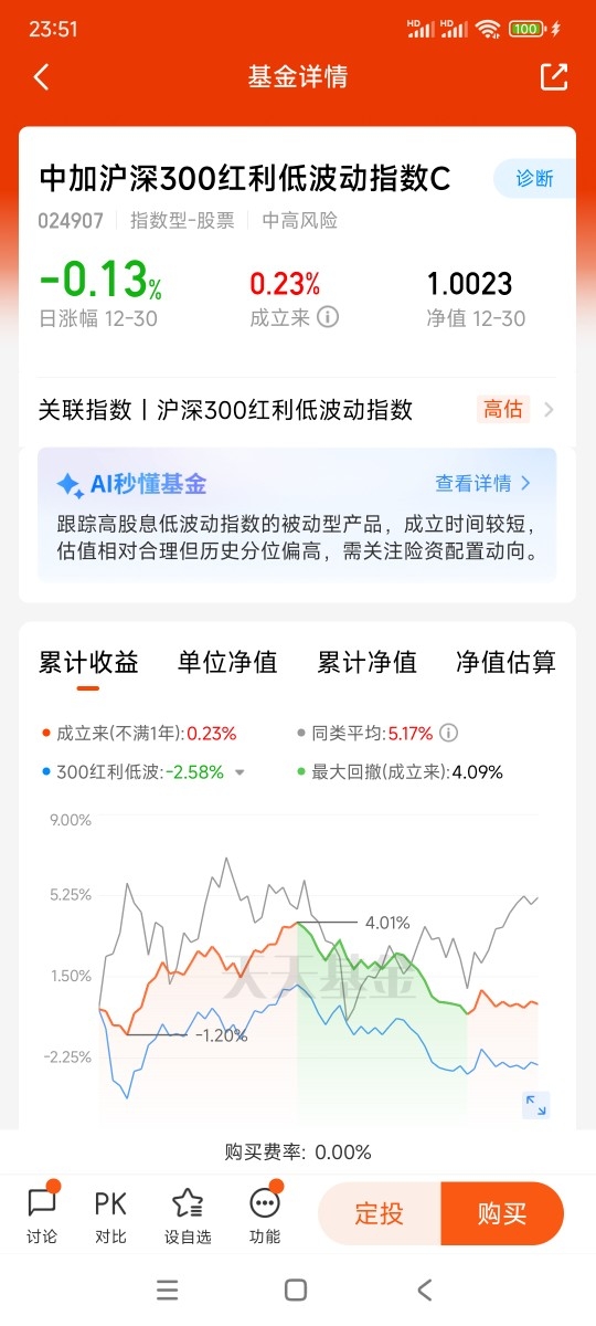 #年末如何防守反击# 最近$中加沪深300红利低波动指数C$ 出现了调整,今天跌了0.12%,近一个月跌了1.6%,为什么我还强烈看好红利基金,答案很简单,因为是低利率时代稳赚,高股息红利投资才是真香,还得选带"双保险"。