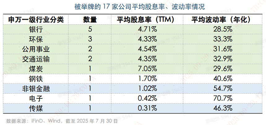 仔细来看,这17家被举牌的公司,主要集中在银行、环保、公用事业、交通运输、煤炭行业。如果计算同一行业的公司近一年的平均股息率和波动率,可以发现上述五个行业的公司平均股息率都超过4%、平均波动率也更低,普遍属于高股息标的。