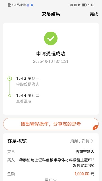 1.科创半导体材料设备:我今天新建仓$华泰柏瑞上证科创板半导体材料设备主题ETF发起式联接C(OTCFUND|024975)$1000元。这支基金是上证科创板半导体材料设备指数(950125)的ETF联接基金。该指数在上证科创板内业务涉及半导体材料和半导体设备等领域的股票作为指数样本。指数近1年涨45.55%,近3月涨52.58%,近1月涨35.94%,近1周涨3.05%,今年以来涨64.29%,表现非常优秀。本基金紧密跟踪指数,聚焦半导体产业链,受益于国产替代及AI产业需求扩张明显。展望未来,国内1.3万亿元规模的半导体市场对自主产品需求迫切,而高端芯片、核心设备的国产化率还不到35%,替代空间巨大。基金经理李沐阳深耕半导体相关领域,对行业有更深的理解和更专业的研究,任职本基金以来70余天,回报率为36.80%,业绩爆发力非常强。我对本基金接下来的表现非常有信心,今天趁着板块小调整果断建仓。下面我晒一下买入操作记录: