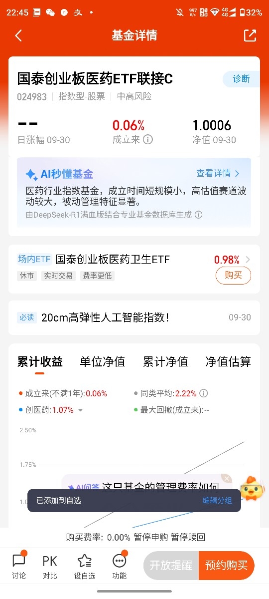 3. 长期持有,忽略短期波动:创业板医药的20CM涨停固然刺激,但短期波动也同样剧烈——有时单日涨20%,次日可能回调5%。我从不去纠结“要不要卖在涨停板”,而是更看重赛道的长期逻辑:创新药的出海红利、医疗器械的国产替代、老龄化带来的医疗需求增长,这些趋势不会因短期市场情绪而改变。持有国泰创业板医药卫生ETF发起联接A的这7个月,我很少每天看净值,而是每季度根据行业政策(如医保谈判、创新药审批进度)和基金季报调整策略,心态更稳,收益也更扎实。