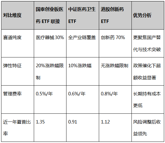国泰创业板医药卫生ETF联接基金在赛道纯度、弹性特征与成本效率上具备差异化竞争力。 与宽基医药ETF相比,该基金聚焦创业板龙头,前十大成分股权重45%,医疗器械、创新药等高成长赛道占比更高,而宽基ETF中药等传统板块权重超20%。费率方面,A类份额管理费0.5%/年,持有超1年免赎回费,较主动管理型基金平均1.2%的管理费更具成本优势;C类份额无申购费且7天以上免赎回费,适合波段操作。