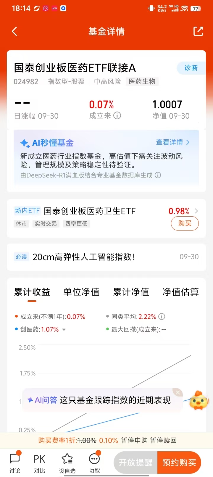 基金母基金(159377)规模与交易活跃度是工具化属性的关键指标。截至2025年6月,国泰创业板医药卫生ETF规模达2215万元,日均成交额稳定在800万元以上,为资金进出提供流动性保障。从资金流向看,2025年二季度医药主题ETF整体净流入超9.18亿元,反映市场对板块的配置热情回升。
