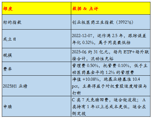 3. 国泰创业板医药ETF联接基金费率低、跟踪稳、规模适中,为普通投资者提供了“十元即可一键配置 50 只龙头”的便捷工具;