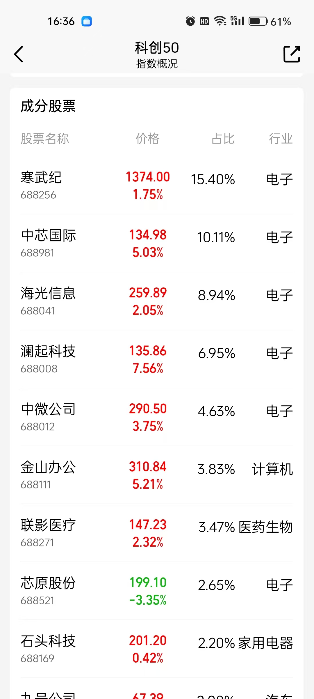 3,从具体的行业分布看,半导体行业现在已经占科创50指数的半壁江山了,半导体行业占比超过了50%,再就是医疗器械、软件开发、光伏设备、消费电子,基本上都是科技含量很高的行业。