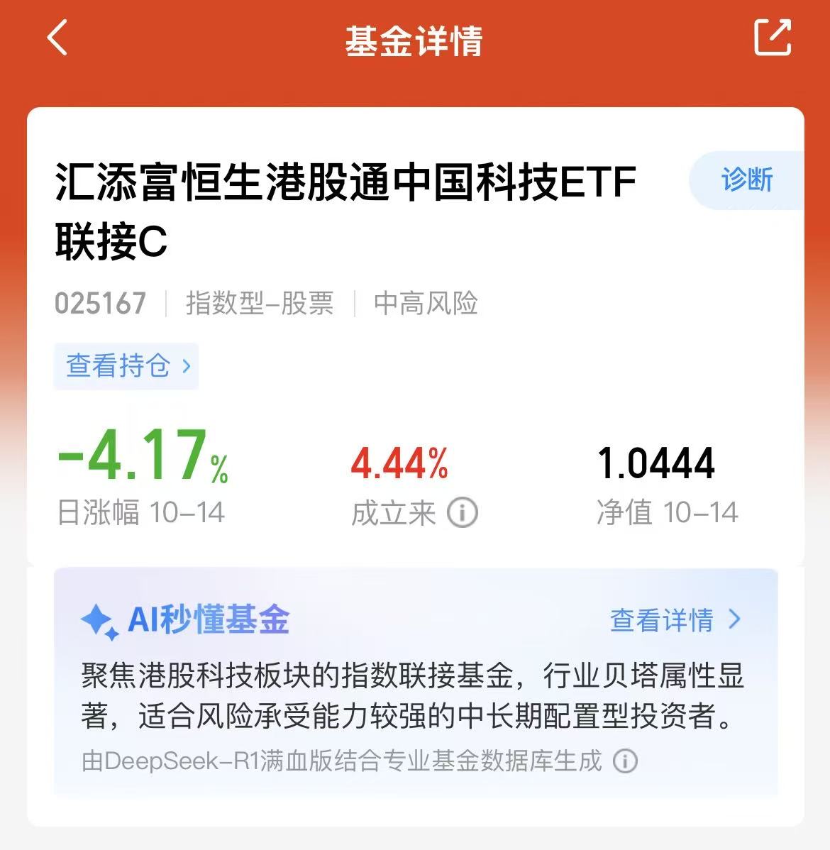$汇添富恒生港股通中国科技ETF联接C(OTCFUND|025167)$,跟踪的指数是聚焦 100%科技属性,相较于恒生科技指数会更有锐度,会更专注于 TMT 行业,AI 相关属性更突出,弹性也更大,前十大重仓股有阿里巴巴、腾讯控股、小米集团等等,都是当下的热门龙头企业呢,具有强大的竞争力和盈利能力,而且经过这几天的震荡回调,眼下也处于低位,补涨空间大,今天目前估值上涨2.57%,眼看就要慢慢回暖了,我也打算分批慢慢的布局起来,长期看好的呢!