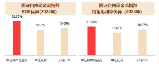 永赢这款产品跟踪的国证自由现金流指数,真的踩中了这个风口。它的长期收益很亮眼,近5年收益超过200%,年化能到24.67%,过去10个完整年度里有7年同时跑赢中证红利和沪深300,长期超额收益很扎实。更重要的是,这个指数的成分股盈利质量过硬,2024年的ROE和销售毛利率都比中证红利、沪深300指数更优,这也是吸引稳健资金的关键。