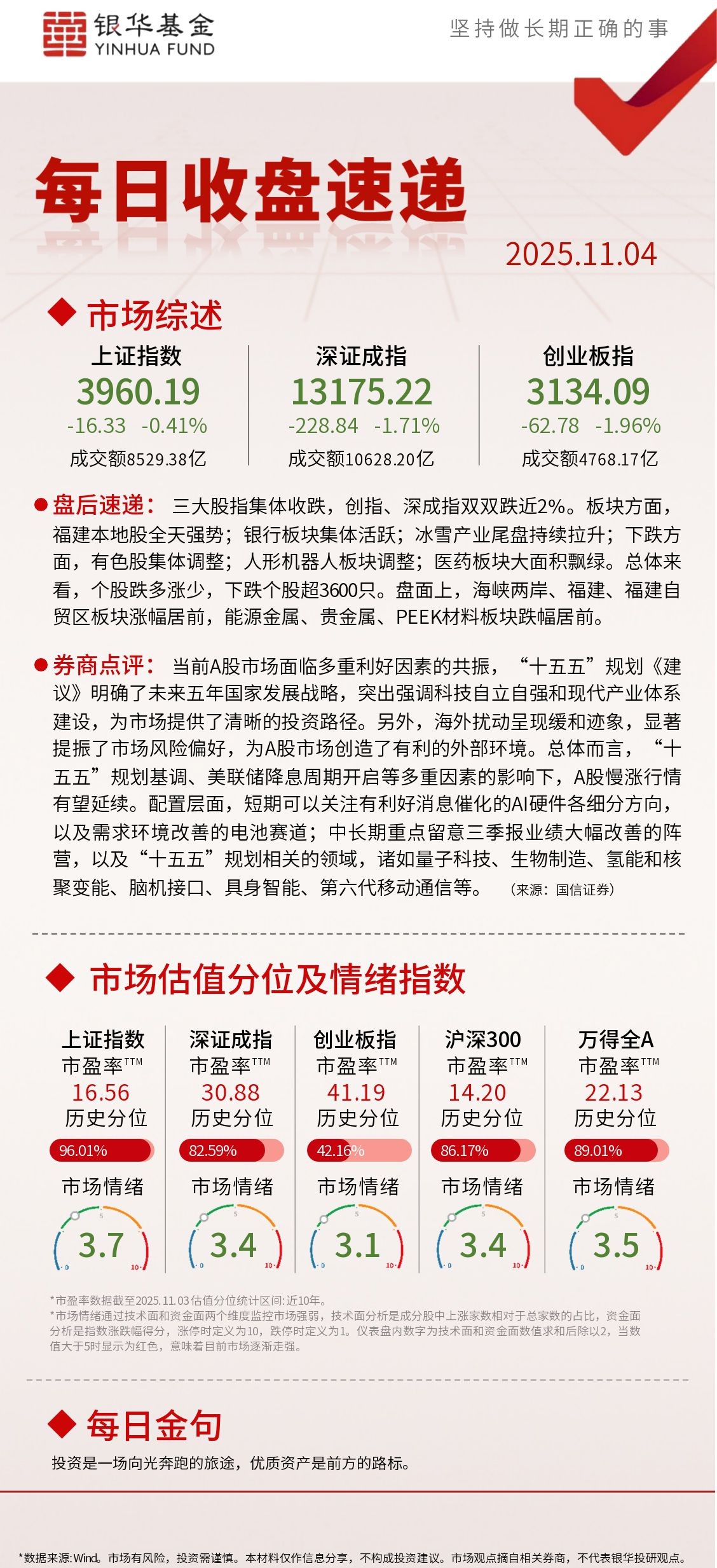 每日收盘速递 | 2025.11.4 三大股指集体收跌,创指、深成指双双跌近2%