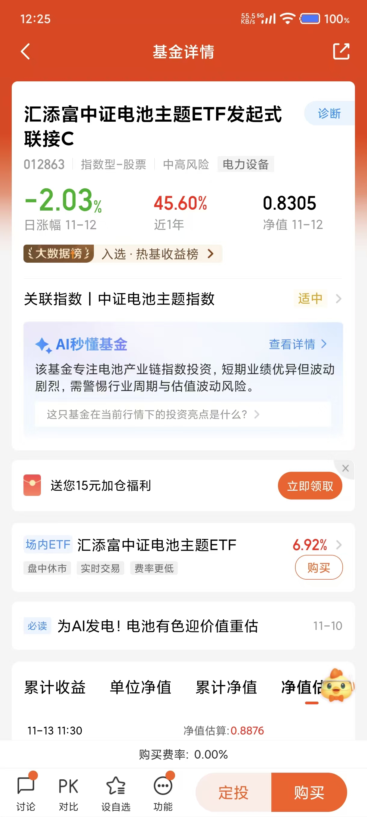 汇添富中证电池主题ETF联接C(012863 )是一只指数基金。这只基金主要跟踪中证电池主题指数,从沪深市场中选取业务涉及电池制造、电池材料、电池设备等细分领域的上市公司前十大重仓股包括:阳光电源、宁德时代、三花智控、亿纬锂能等。$汇添富中证电池主题ETF发起式联接C(OTCFUND|012863)$