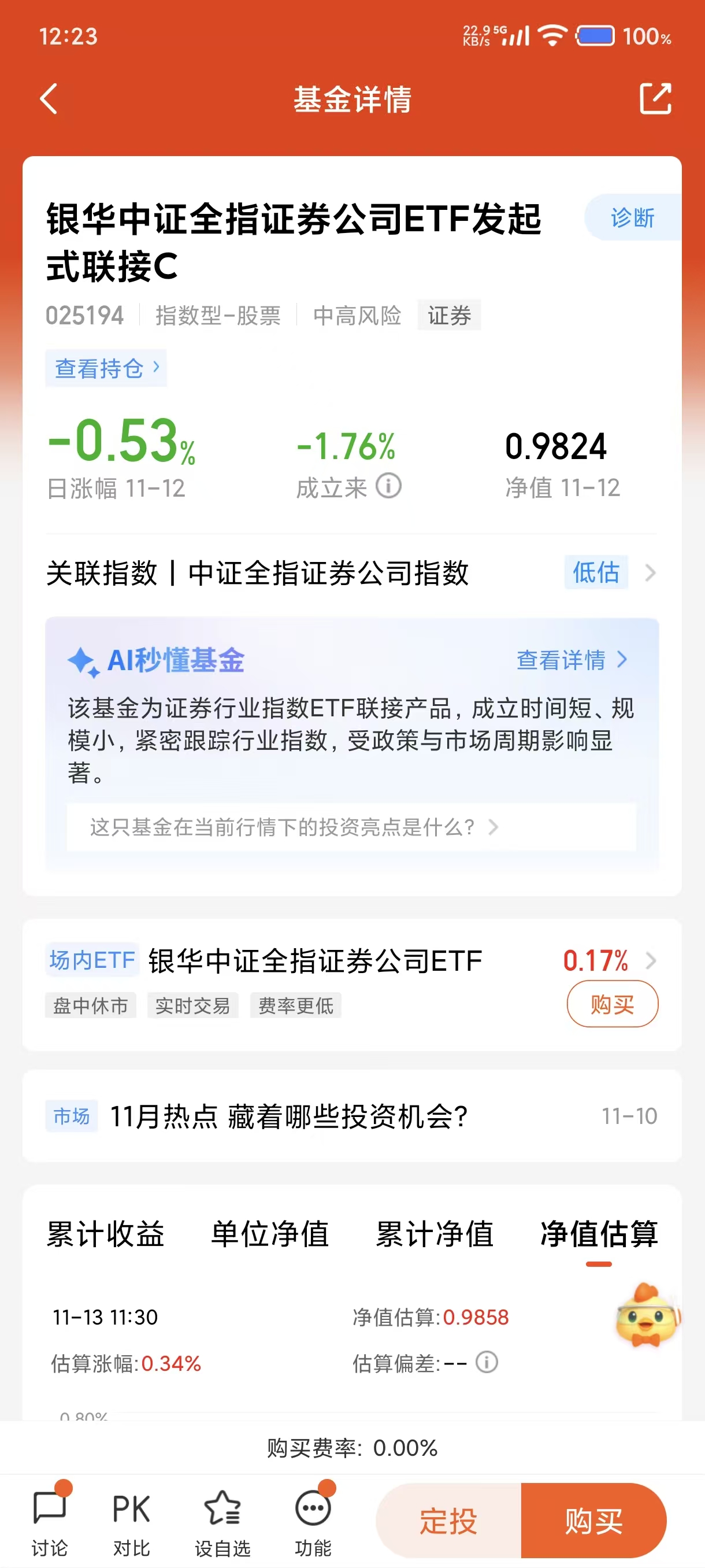今天我选择继续加仓5000元银华中证全指证券公司ETF联接C(025194)),这只基金跟踪中证全指证券公司指数,覆盖了A股所有上市的券商,包括中信证券、华泰证券、东方财富等龙头公司,它的最大亮点在于管理费和托管费同业最低,这对于长期持有来说,可以节省不少成本。$银华中证全指证券公司ETF发起式联接C(OTCFUND|025194)$