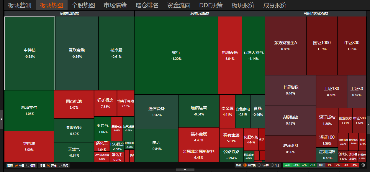 盘面上,银行股回调,主力资金爆拉创业板权重股,题材概念全线走强。固态电池、六氟磷酸锂、电解液、锂资源等锂电池概念全线爆发,盛新锂能、石大胜华等多股涨停,宁德时代涨超8%逼近历史新高;有色金属、小金属、黄金概念集体大涨,中矿资源、盛屯矿业、国城矿业等涨停;