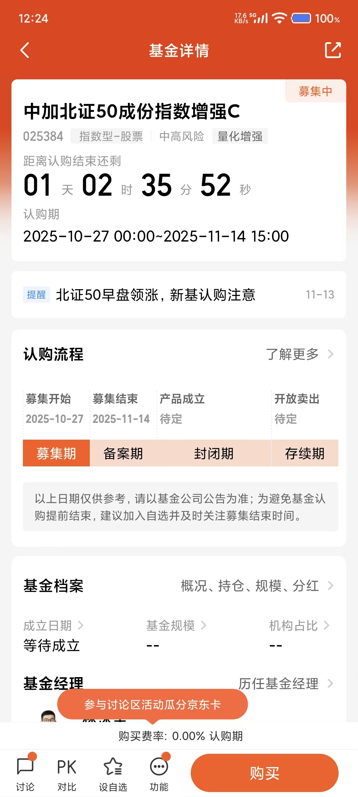 2、今天北证50指数也是大涨,我选择加仓1000元中加北证50成份指数增强C(025384),它是一只正在发行的指数增强型基金,在跟踪北证50指数的同时,通过量化策略力争实现超越指数的收益。从当前时点来看,11月以来北证50指数反复震荡,新基金建仓投资性价比更高,是个不错的布局时点。$中加北证50成份指数增强C(OTCFUND|025384)$