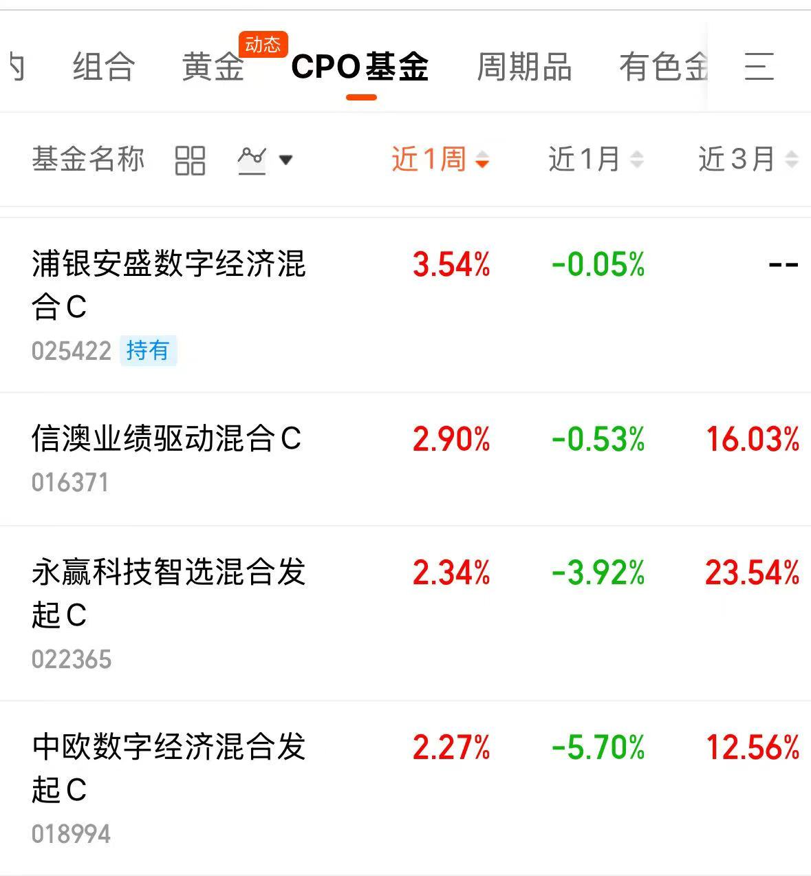 浦银安盛数字经济新基金发力猛,cpo巨头再添新将,不管是光模块新技术概念上涨还是龙头上涨都能跟上!下面大家跟随猴哥视角看看数字经济前二天的涨幅及的涨幅,就能更加直观观察出来。猴哥先加仓1000块,后续有回调再跟进。相关基金:$浦银安盛数字经济混合C(OTCFUND|025422)$$浦银安盛数字经济混合A(OTCFUND|025421)$
