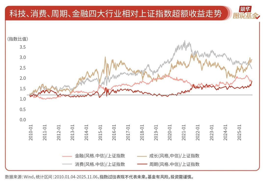2、四大板块在不同时期呈现出不同的演变情形,虽然行业轮动不会完全准确地按照过往规律演变,但了解重要影响因素,可以一定程度帮助我们把握宏观趋势,力争提高胜率。