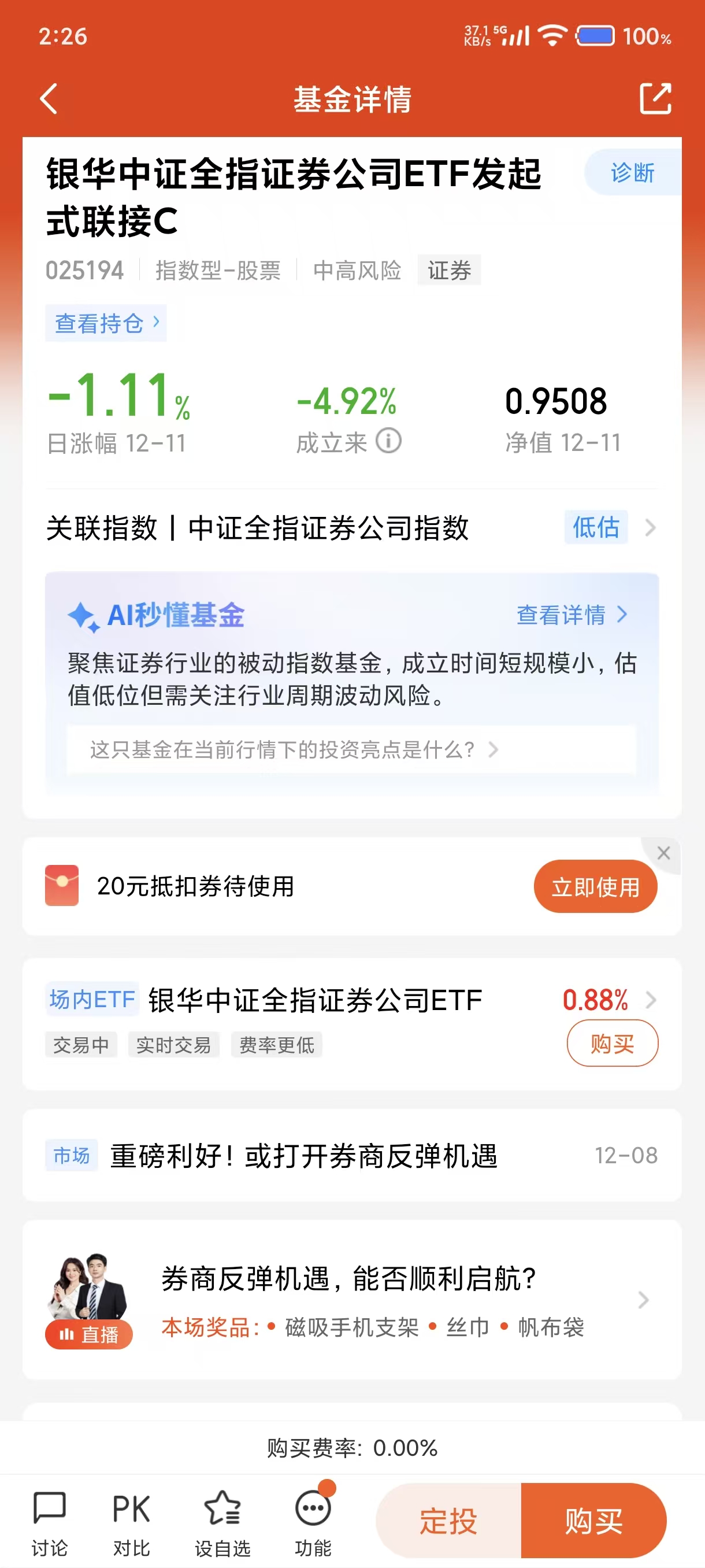 今天我选择继续加仓5000元银华中证全指证券公司ETF联接C(025194)),这只基金跟踪中证全指证券公司指数,覆盖了A股所有上市的券商,包括中信证券、中金公司、华泰证券、东方财富等龙头公司,它的最大亮点在于管理费和托管费同业最低,这对于长期持有来说,可以节省不少成本。$银华中证全指证券公司ETF发起式联接C(OTCFUND|025194)$