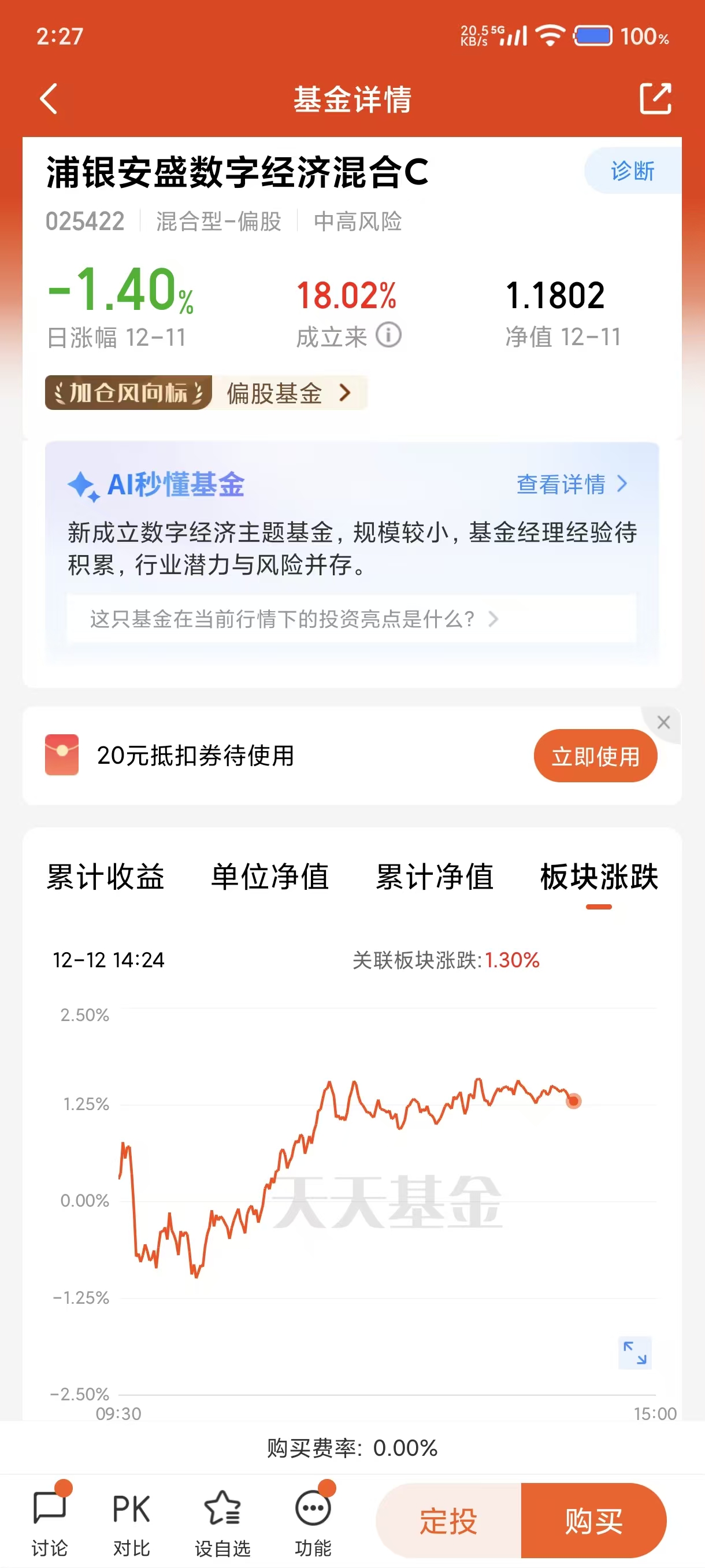 今天我选择加仓1000元浦银安盛数字经济混合C(025422),基金主要聚焦于通信CPO,基金经理也是通信研究员出身,这只基金从成立以来表现十分优异,近一周就涨15.1%,远超同类平均。而且弹性足跌的少,因为新基金调仓灵活,我会持续加厚仓位,长期看好它的表现。$浦银安盛数字经济混合C(OTCFUND|025422)$