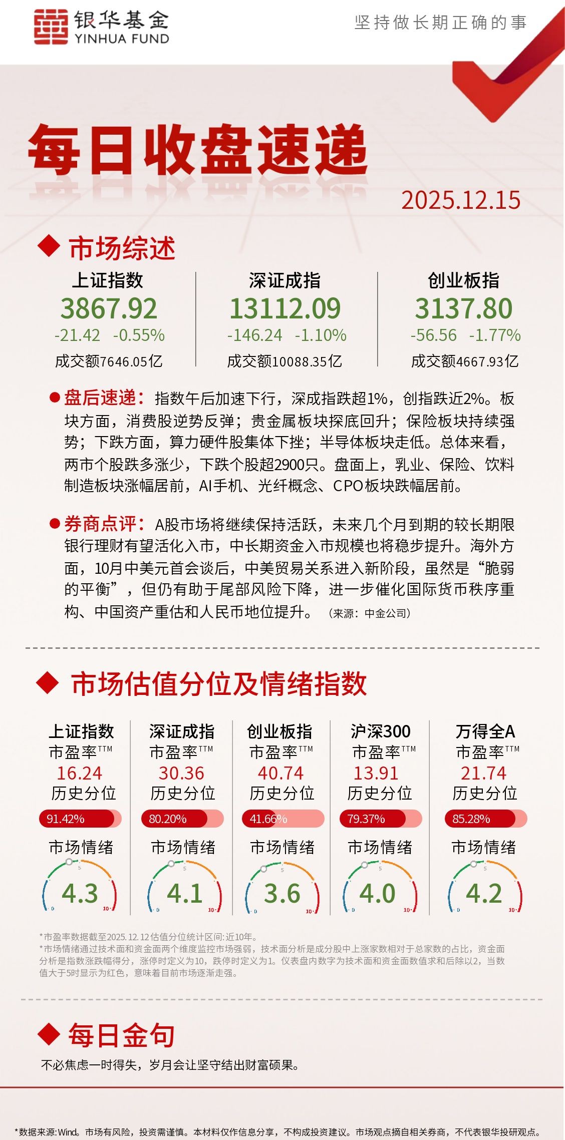 每日收盘速递 | 2025.12.15 深成指、创指双双跌超1%,消费股逆势反弹