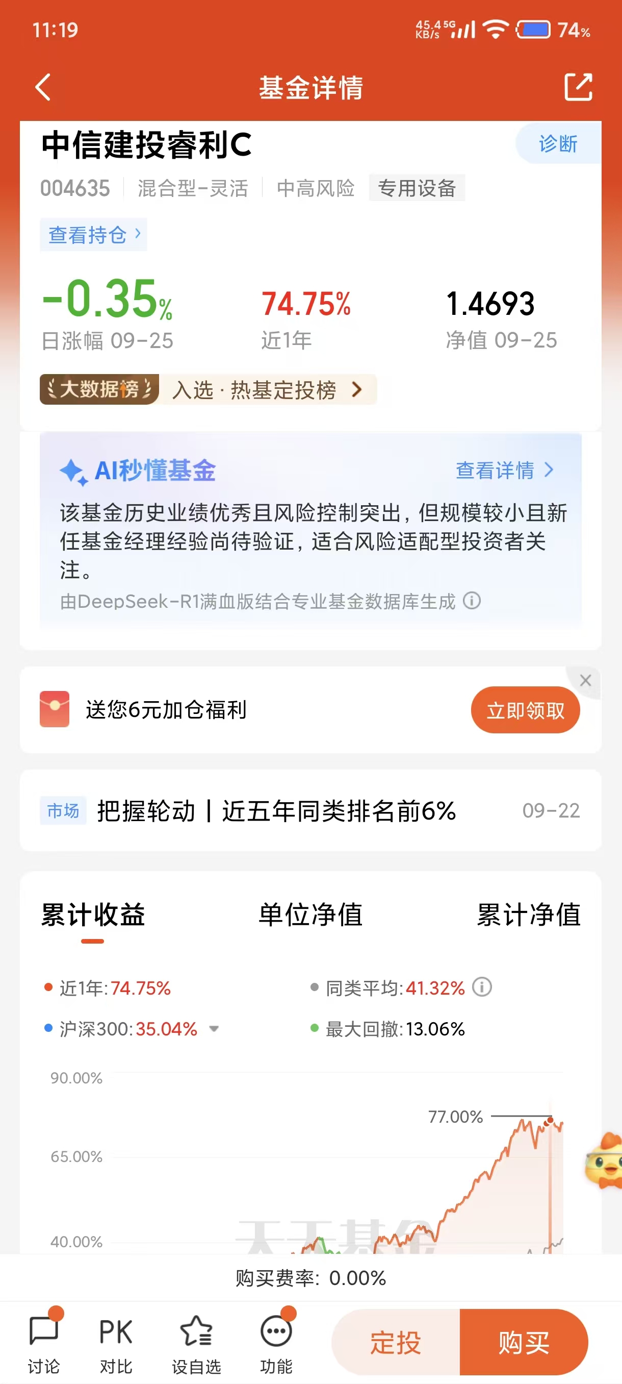 这只基金主要采用量化投资策略,通过历史数据和量化模型选股,我对比了国金量化多因子和诺安多策略这类量化基金,中信建投睿利灵活配置更适合现阶段,今天我选择上车2000元,长期看好这只基金的后续表现。$中信建投睿利C(OTCFUND|004635)$