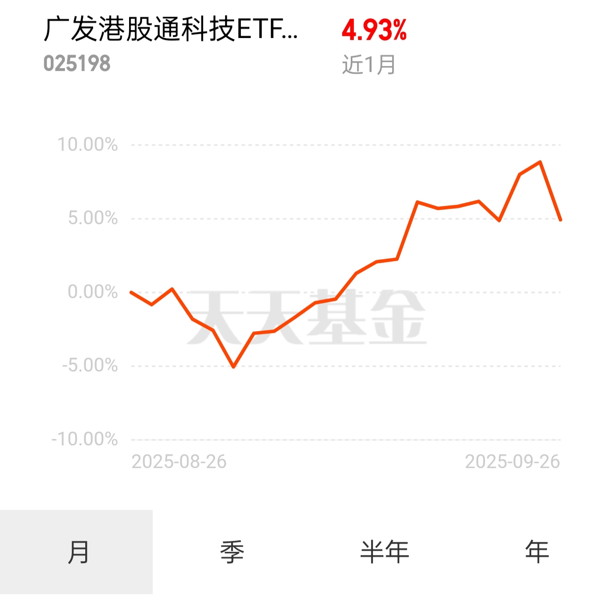 国庆港股科技板块走势先扬后抑,不过总体还是上涨的,继续看好。这只$广发港股通科技ETF联接C$(025198)紧密跟踪港股通科技指数,涵盖了腾讯、阿里巴巴、美团等优质的港股科技企业,去年924行情以来表现超过恒生科技指数,弹性更高#10月基金投资策略#