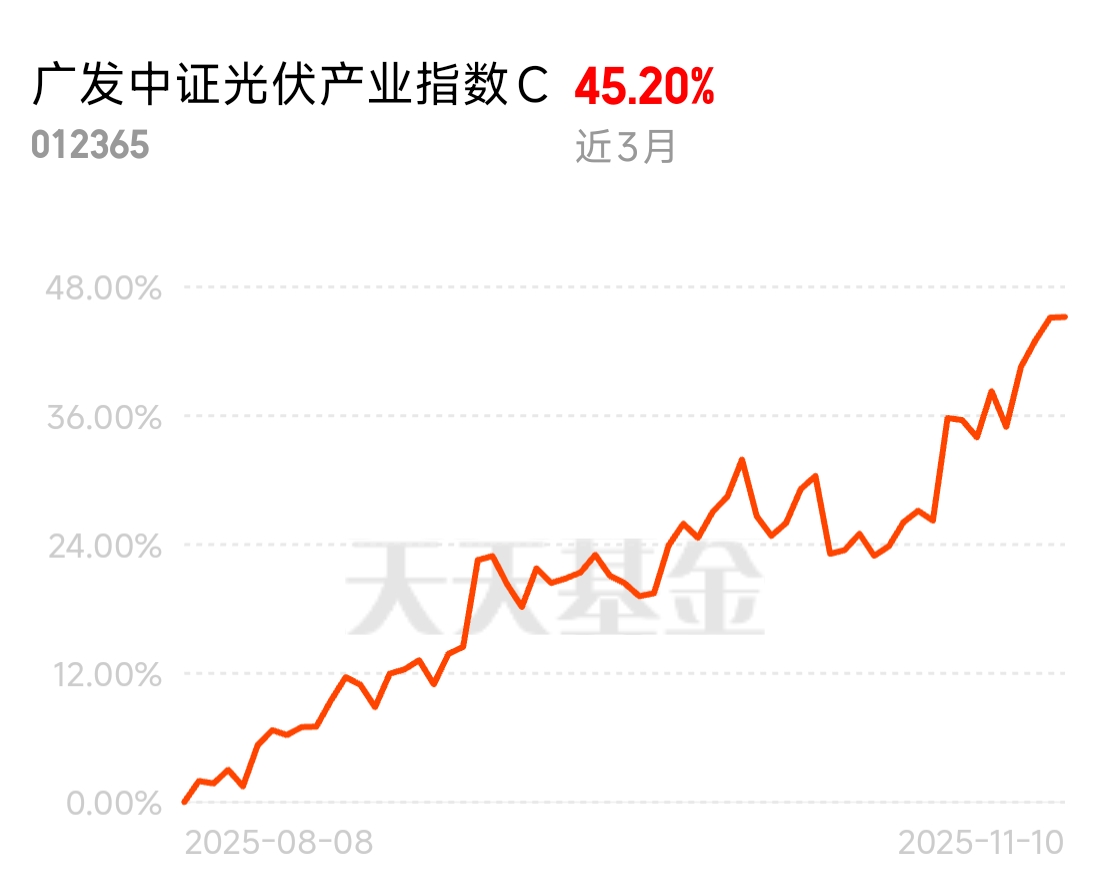 预计前面还在犹豫进不进光伏的大腿拍断!3个月45个点谁能想到,趁着光伏行情还在我也小加一点,进场$广发中证光伏产业指数C$
