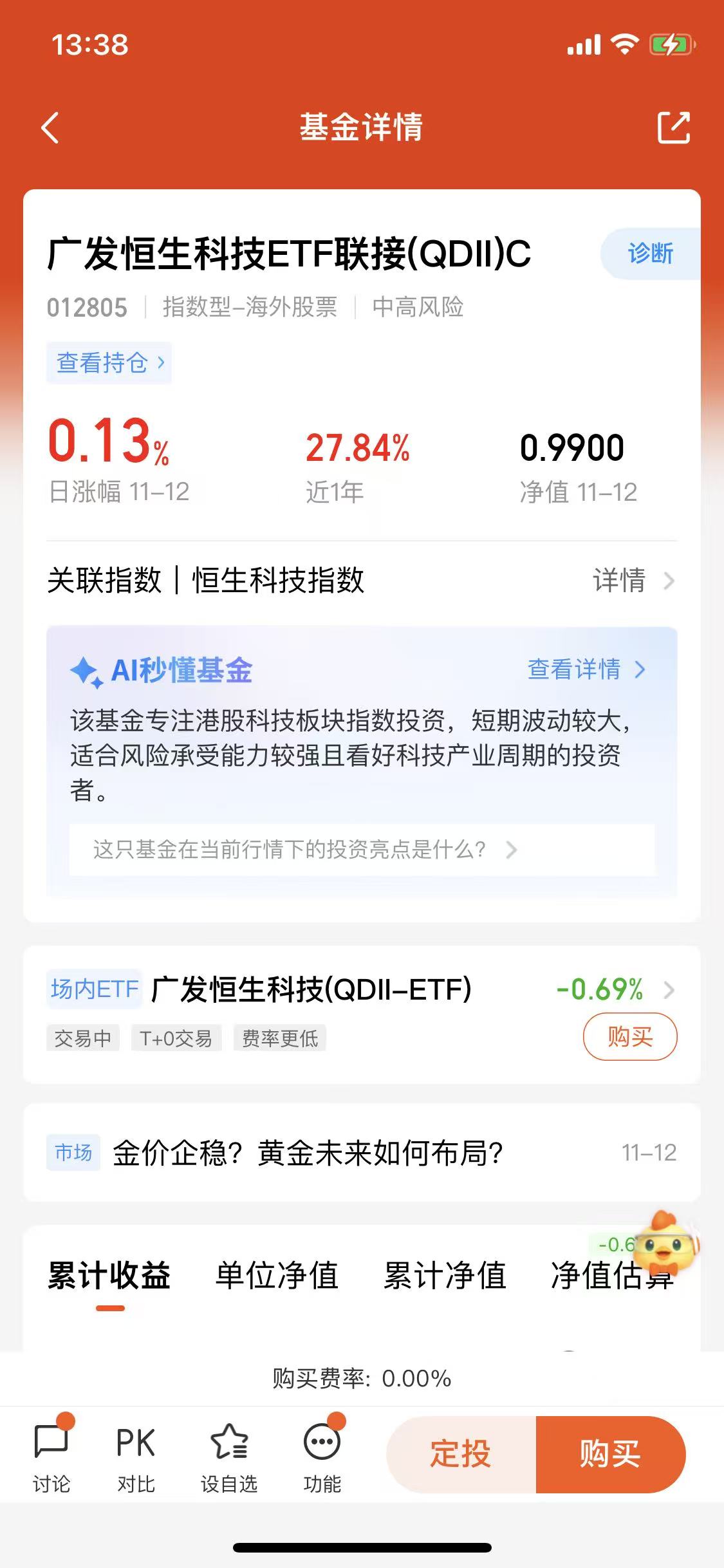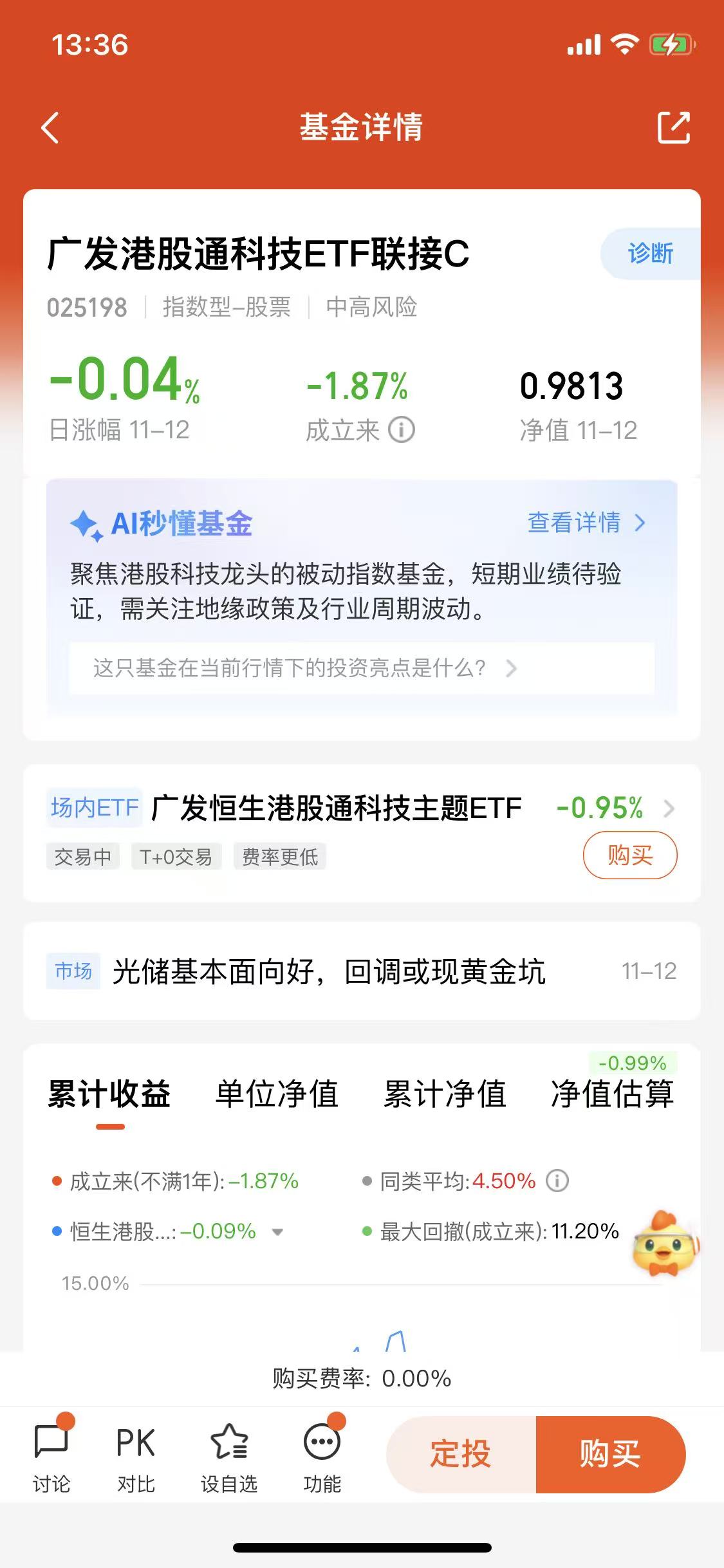 对于指数基金来说,费率是影响长期收益的关键因素,而广发港股通科技ETF联接C(025198)的费率设计堪称“亲民”。它不仅没有申购费,更重要的是持有满7天就免赎回费,这对于想灵活调整仓位的投资者来说,大大降低了交易成本。对比同类港股科技ETF联接基金,它的综合费率处于较低水平,长期持有下来,节省的费率会转化为实实在在的收益。对于普通人来说,不用为高昂的手续费纠结,也不用因为短期调整而担心赎回成本,能够更从容地坚持长期投资计划。