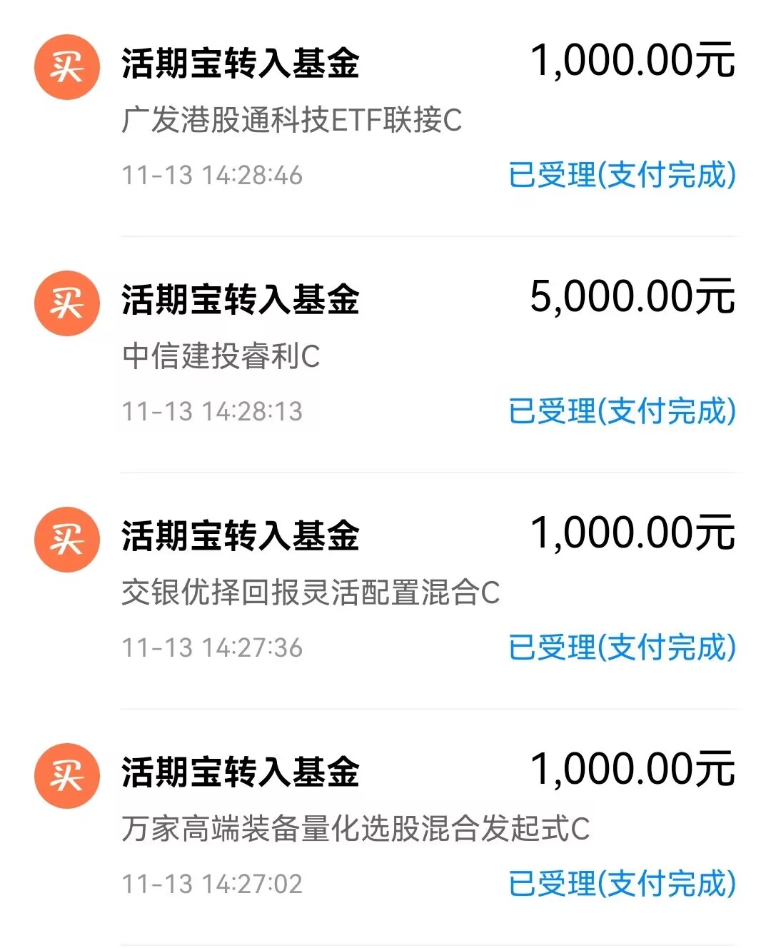 1、$广发港股通科技ETF联接C(OTCFUND|025198)$,买入1000元