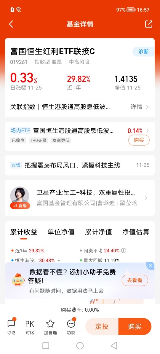 手里还拿着广发那只港股科技,但富国恒生红利C近1年涨了30%,超越大多数同类,过