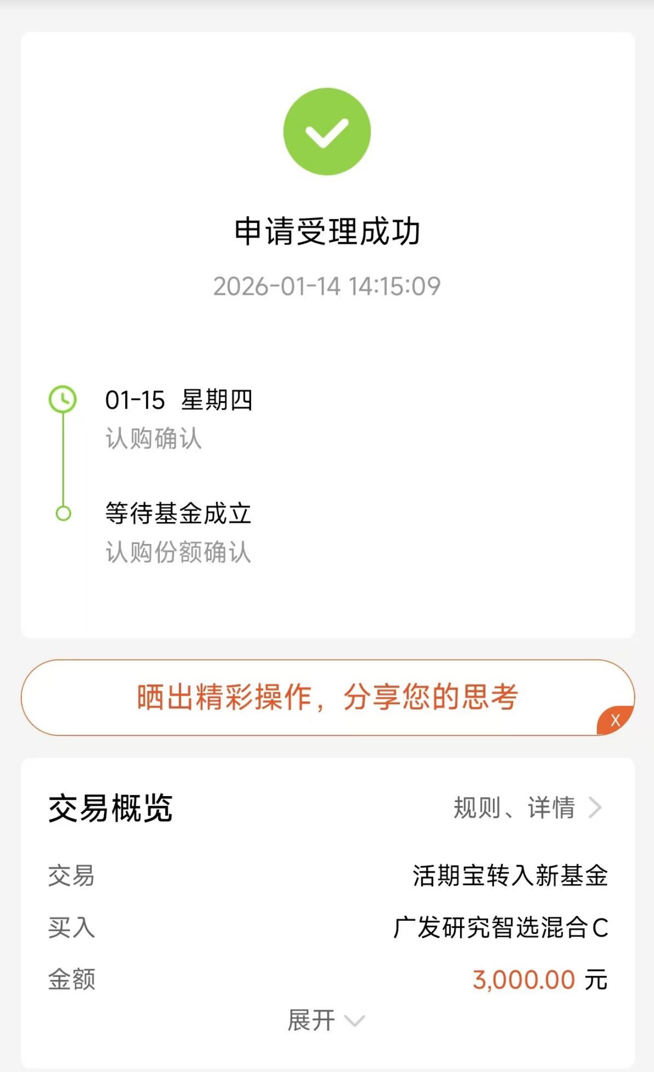 拿着这只当了底仓,今天又买了这个经理管理的这只新基广发研究智选,丰富一下持仓,趁着最后倒计时,买了5000试试