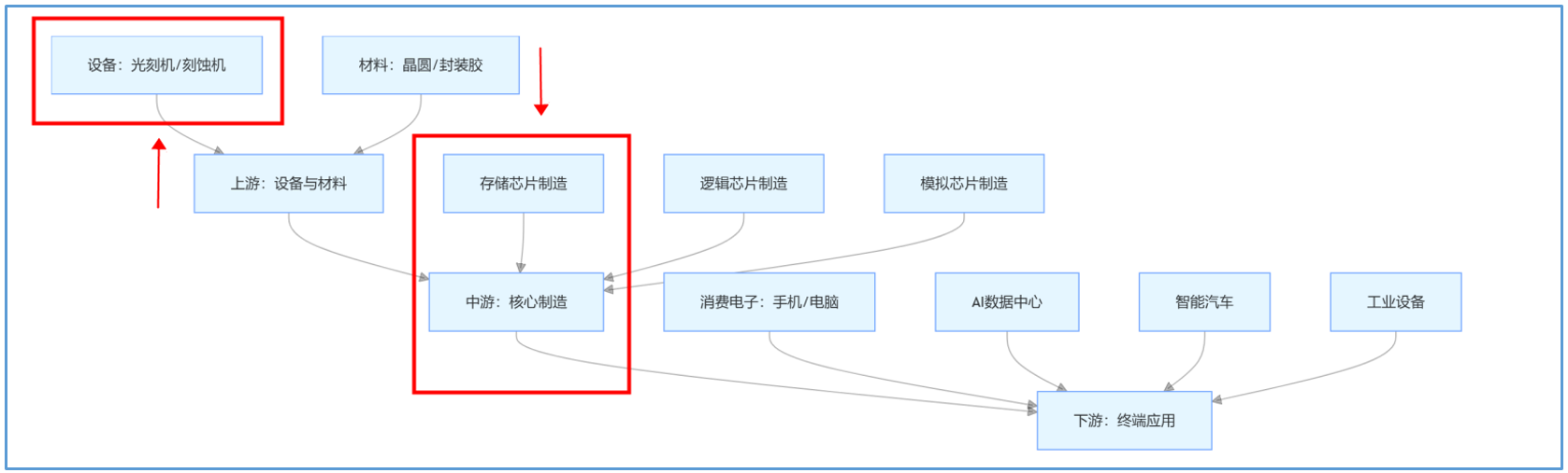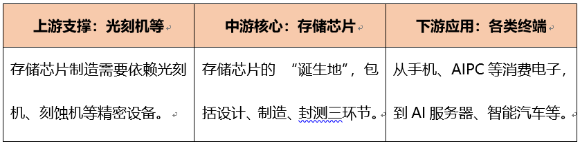 半导体产业链呈“金字塔结构”,存储芯片处于产业链中游,上承设备材料,下接终端应用,扮演着承上启下的重要角色。