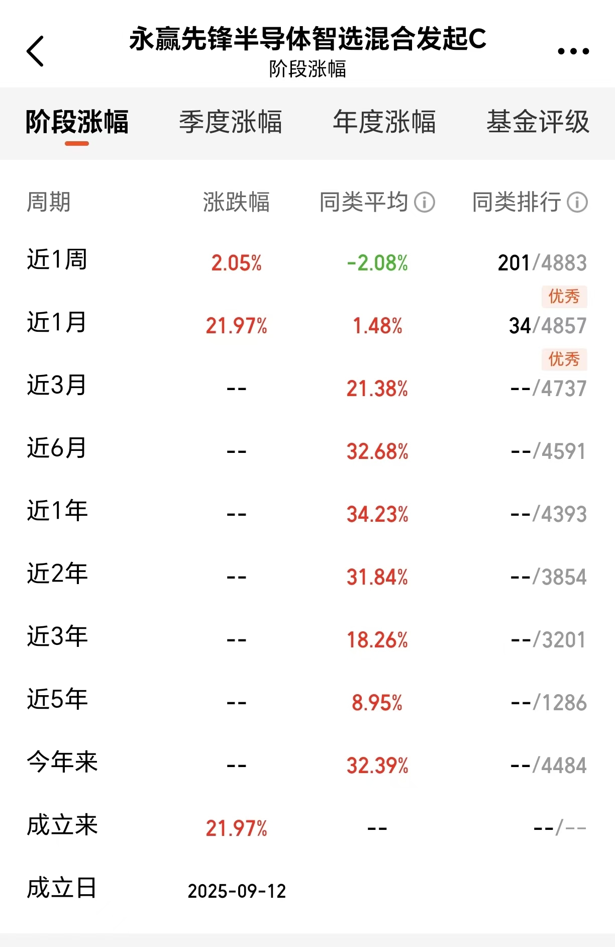 在全球存储芯片巨头涨价或计划涨价的背景下,存储芯片成了资本市场追逐的宠儿。$永赢先锋半导体智选混合发起C$ (025209)作为永赢智选系列的全新产品,聚焦的就是存储芯片这一热门赛道,在行业迎来新一轮景气周期的当下,这款精准布局细分领域的新基值得关注!随着近期存储芯片行情持续,业绩表现也不错,成立不到一个月,收益已经达到了21.97%。