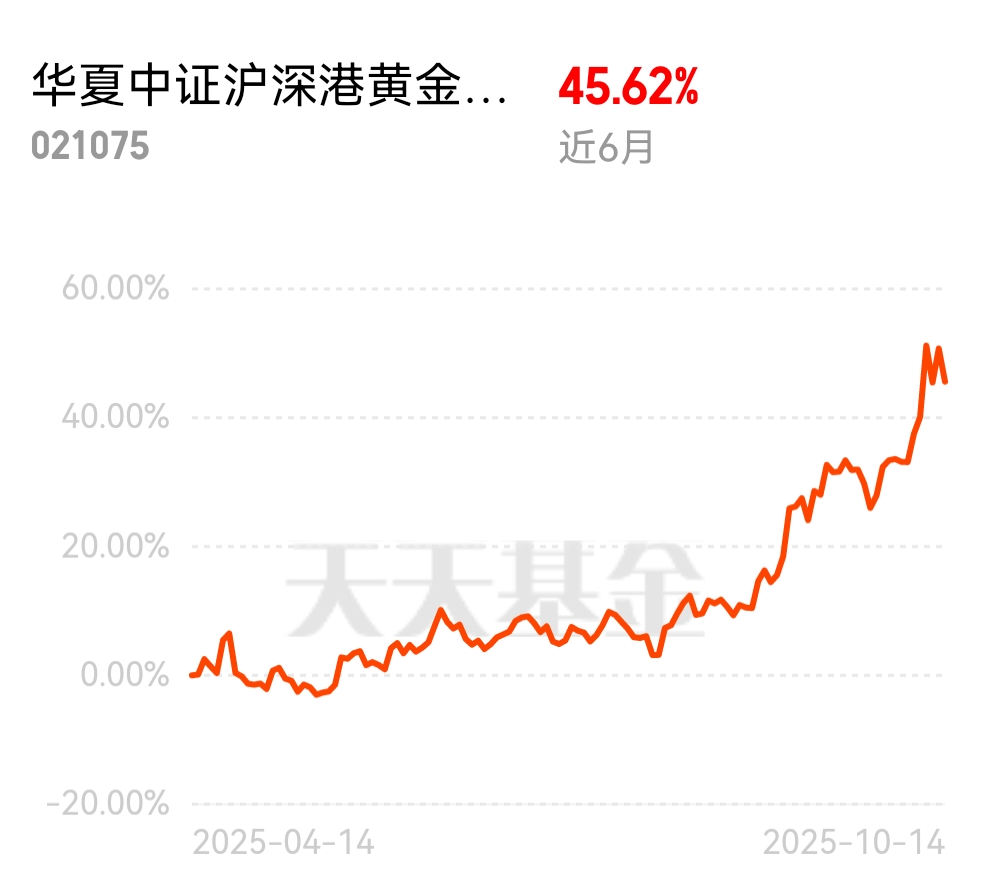 金价核心驱动为利率下行、市场避险需求增强,近1个月收益9%+,近3月收益35%+,近6月收益45%+,这里反弹一向不错,弹性比黄金高,调整期间考虑定投了$华夏中证沪深港黄金产业股票ETF发起式联接C$