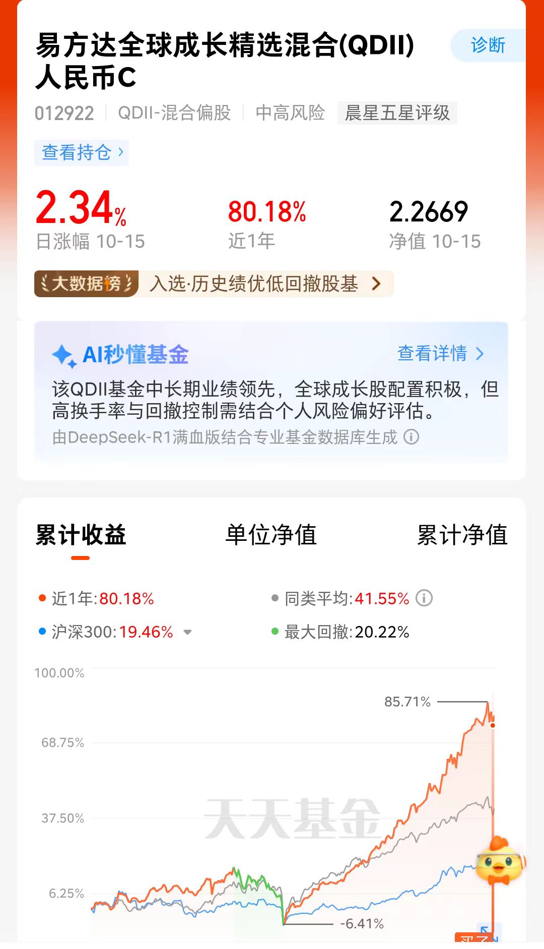 最近这几天股市处于调整状态,昨天科技板块也出现了调整,但是我觉得科技板块还是没有走完的,海内外都有很大的机会呢。易方达全球成长精选混合(QDII)C012922是布局全球科技的,他的基金经理通过及时调仓控制住了回调,通过灵活规避政治风险,同时可以把握多个市场的科技成长机遇呢。近期也开始限购了,他业绩稳定,可以随时上车的,定投也是不错的选择呢。